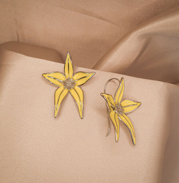 Cowslip Orchid flower in enamel with a sterling silver hook.